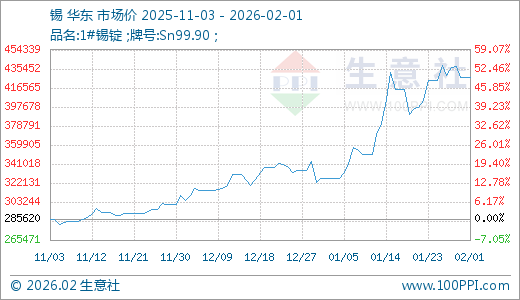 据生意社监测,锡02月01日最新价格427370.00元/吨,最近10天上涨5.65%,20天上涨15.46%,30天上涨30.96%,60天上涨38.20%。