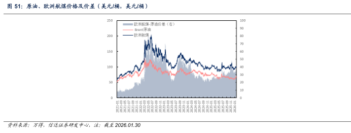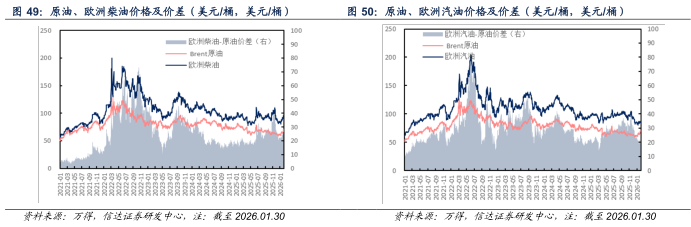 欧洲市场:截至2026年01月30日当周,欧洲柴油、汽油、航煤周均价分别为93.22(+3.43)、86.71(+1.17)、101.81(+3.17)美元/桶;与原油差价分别为25.49(+0.25)、18.98(-2.00)、34.07(-0.01)美元/桶。
