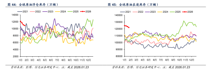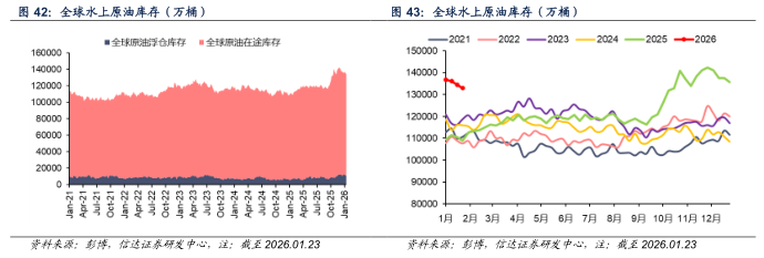 截至2026年1月23日当周,全球原油水上库存(包括在途和浮仓)为13.29亿桶,较上周-1601.2万桶(-1.20%)。其中,全球原油浮仓库存为10926.3万桶,较上周-201.2万桶(-1.84%);全球原油在途库存为12.2亿桶,较上周-1400万桶(-1.15%)。