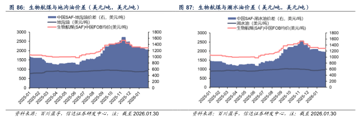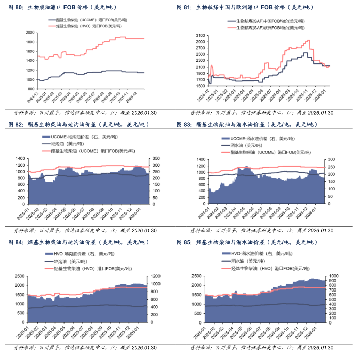 生物航煤价格及价差:截至2026年1月30日,中国生物航煤港口FOB价格为2150美元/吨,较上周五价格持平,与地沟油、潲水油价差分别为1237.22、1178.30美元/吨,较上周五价差-2.86、-1.00美元/吨。欧洲生物航煤港口FOB价格为2140美元/吨,较上周五价格+30美元/吨。
