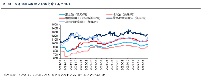 原料油价格:截至2026年1月30日,中国地沟油、潲水油价格分别为912.78、971.70美元/吨,较上周五价格+2.86、+1.00美元/吨,中国餐厨废油UCO价格为1075美元/吨,较上周五价格+15美元/吨。