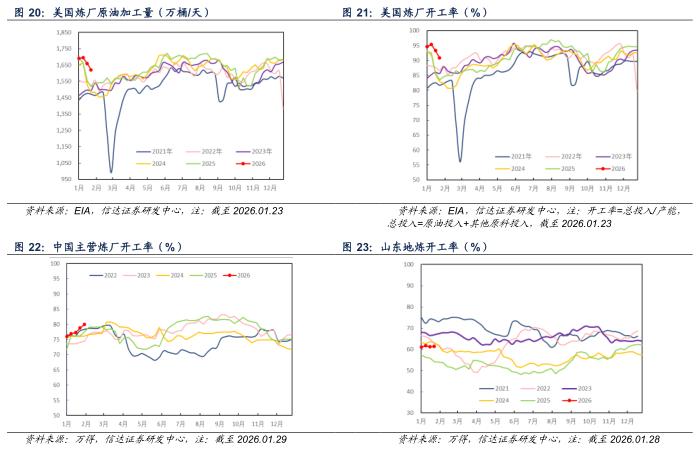 【美国原油需求】截至2026年01月23日当周,美国炼厂原油加工量为1620.9万桶/天,较上周减少39.5万桶/天,美国炼厂开工率为90.90%,较上周下降2.4pct。