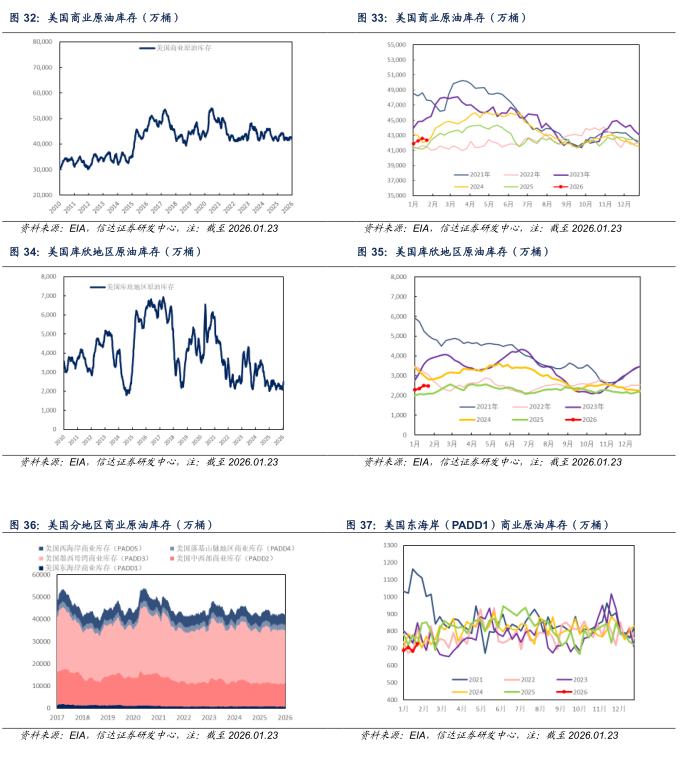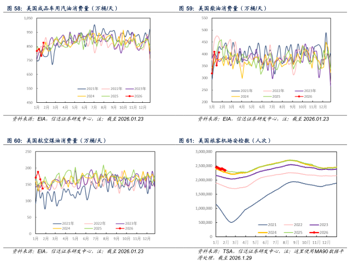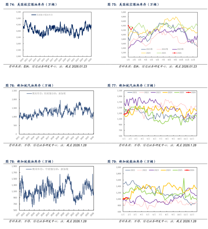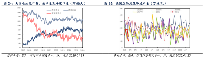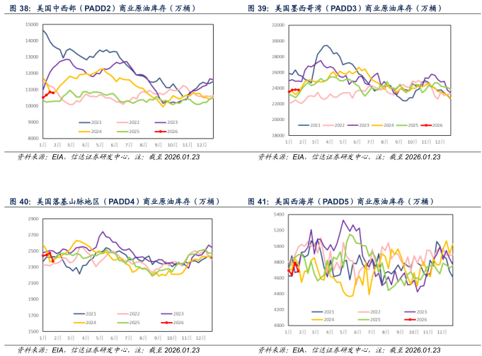 产量方面:截至2026年01月23日当周,美国成品车用汽油、柴油、航空煤油产量分别为957.4、481.9、174.2万桶/天,较上周分别+79.1(+9.01%)、-26.8(-5.27%)、+2.4(+1.40%)万桶/天。
