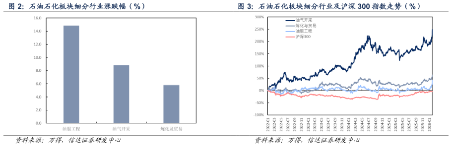 截至2026年1月30日当周,油服工程板块上涨14.83%,油气开采板块上涨8.84%,炼化及贸易板块上涨5.79%。