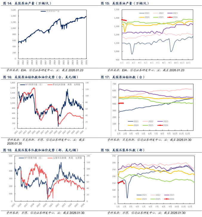 【美国原油供给】截至2026年01月23日当周,美国原油产量为1369.6万桶/天,较上周减少3.6万桶/天。截至2026年01月30日当周,美国活跃钻机数量为411台,与上周持平。截至2026年01月30日当周,美国压裂车队数量为148部,较上周减少15部。