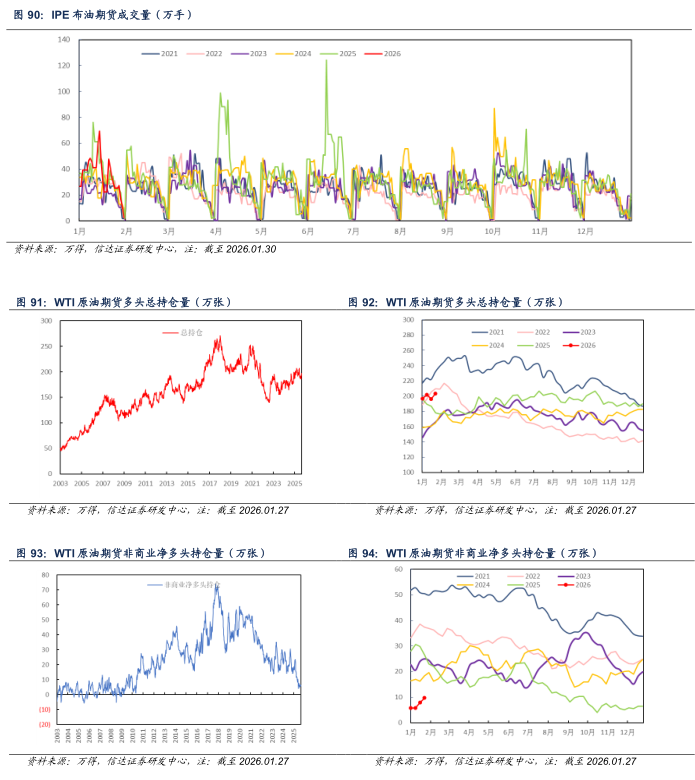 原油期货成交及持仓:截至2026年01月30日,周内布伦特原油期货成交量为134.8万手,较上周减少87.2万手(-39.28%)。截止至2026年01月27日,周内WTI原油期货多头总持仓量为203.56万张,较上周增加7.13万张(+3.63%);非商业(投机和套利目的持有)净多头持仓9.7万张,较上周增加1.82万张(+23.09%)。