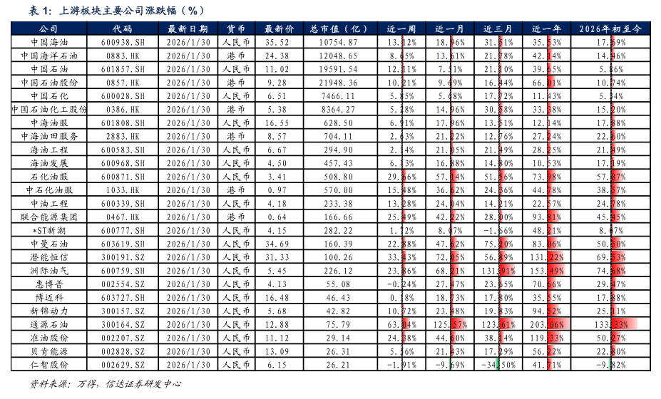 截至2026年1月30日当周,上游板块股价表现较好的是通源石油(+63.04%)、潜能恒信(+33.43%)、石化油服(+29.66%)等。