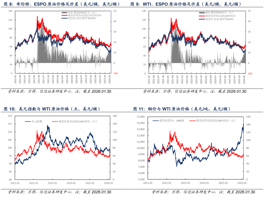 原油价格:截至2026年01月30日当周,布伦特原油期货结算价为69.32美元/桶,较上周上升4.25美元/桶(+6.53%);WTI原油期货结算价为65.21美元/桶,较上周上升4.14美元/桶(+6.78%);俄罗斯Urals原油现货价为65.49美元/桶,与上周持平;俄罗斯ESPO原油现货价为55.46美元/桶,较上周上升4.42美元/桶(+8.66%)。