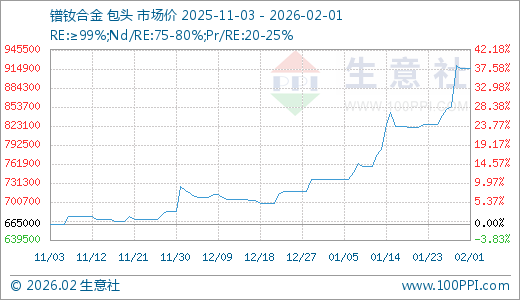 据生意社监测,镨钕合金02月01日最新价格915000.00元/吨,最近5天上涨7.65%,10天上涨10.91%,20天上涨18.06%,30天上涨24.07%,60天上涨27.97%。