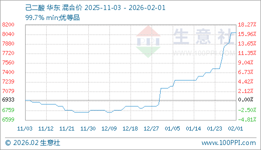 据生意社监测,己二酸02月01日最新价格8066.67元/吨,最近10天上涨8.04%,15天上涨10.00%,20天上涨11.01%,30天上涨13.08%,60天上涨19.21%。