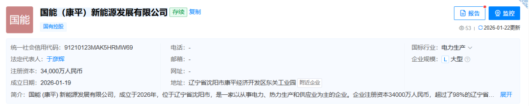 1月19日,国能(康平)新能源发展有限公司成立,注册资本34000万人民币。