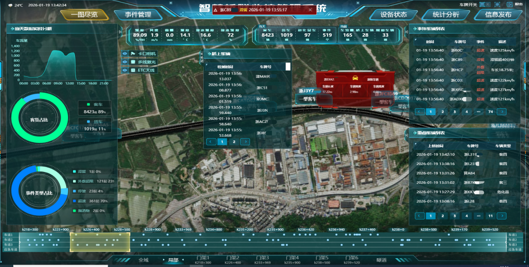 围绕桥梁、隧道及沿线路段的运行管理需求,万集构建了以etc、雷达与视频融合感知为基础的统一运行监测平台,对车辆运行信息、事件信息、设备状态及气象数据进行集中采集与融合处理,实现全线运行态势的统一感知。