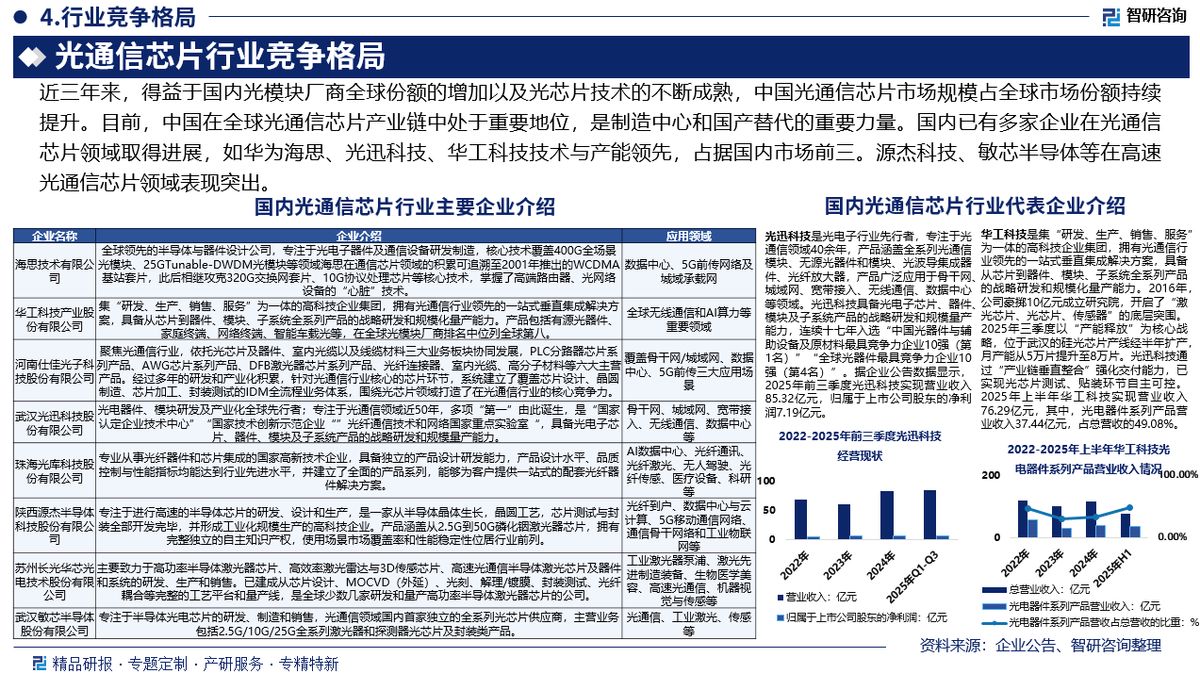 竞争情况:近年来,得益于国内光模块厂商全球份额的增加以及光芯片技术的不断成熟,中国光通信芯片市场占全球份额持续提升。目前,中国在全球光通信芯片产业链中处于重要地位,是制造中心和国产替代的重要力量。国内已有多家企业在光通信芯片领域取得进展,如华为海思、光迅科技、华工科技技术与产能领先,占据国内市场前三。源杰科技、敏芯半导体等在高速光通信芯片领域表现突出。
