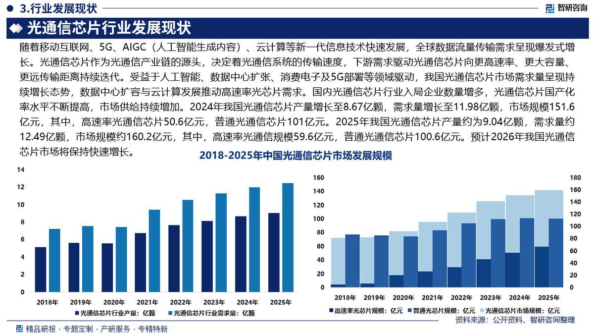 光通信芯片是指能够实现光电信号转换并应用于光通信信号传输的产生、调制、放大和探测等功能的芯片。随着移动互联网、5G、AIGC(人工智能生成内容)、云计算等新一代信息技术快速发展,全球数据流量传输需求呈现爆发式增长。光通信芯片作为光通信产业链的源头,决定着光通信系统的传输速度,下游需求驱动光通信芯片向更高速率、更大容量、更远传输距离持续迭代。受益于人工智能、数据中心扩张、消费电子及5G部署等领域驱动,我国光通信芯片市场需求量呈现持续增长态势,数据中心扩容与云计算发展推动高速率光芯片需求。国内光通信芯片行业入局企业数量增多,光通信芯片国产化率水平不断提高,市场供给持续增加。2024年我国光通信芯片产量增长至8.67亿颗,需求量增长至11.98亿颗,市场规模151.6亿元,其中,高速率光通信芯片50.6亿元,普通光通信芯片101亿元。2025年我国光通信芯片产量约为9.04亿颗,需求量约12.49亿颗,市场规模约160.2亿元,其中,高速率光通信规模59.6亿元,普通光通信芯片100.6亿元。预计2026年我国光通信芯片市场将保持快速增长。
