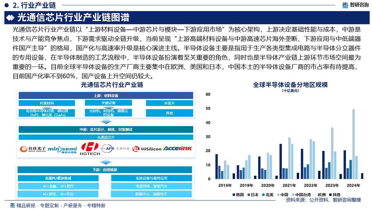 产业链核心节点:光通信芯片行业产业链以“上游材料设备—中游芯片与模块—下游应用市场”为核心架构,上游决定基础性能与成本,中游是技术与产能竞争焦点,下游需求驱动全链升级,当前呈现“上游高端材料设备与中游高速芯片海外垄断、下游应用与中低端器件国产主导”的格局,国产化与高速率升级是核心演进主线。
