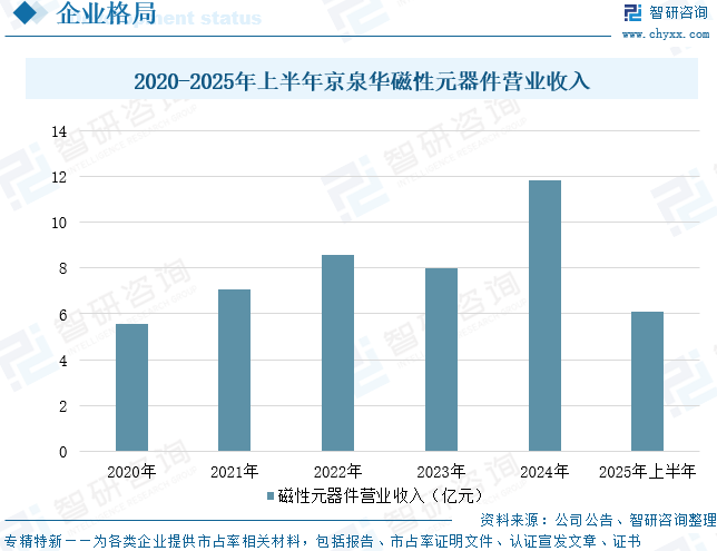 深圳市京泉华科技股份有限公司专注于电子制造行业,是一家集磁集成器件、电源类产品的研发、生产、销售、服务于一体的国家高新技术企业。公司依托模型化设计平台以磁性元器件生产为基础,以电源产品和车载磁性器件同步开发为特色,形成了性能更可靠、质量更稳定、技术更先进的产品线。从1996年公司成立起,公司就致力于以磁电转换技术为核心的相关磁性器件的研发和生产,为全球一流电气厂商提供磁集成器件解决方案,历经多年的积累与沉淀公司在立绕技术、磁组件技术、磁集成技术及全线自动化技术上位于行业头部。公司磁性器件产品按照功率大小分为特种变压器、磁性器件。特种变压器产品包括:逆变器、高频电感、特种电抗器、三相变压器、计量互感器、共模电感、片式变压器产品,其中逆变器、高频电感、特种电抗器为主要产品。磁性器件产品包括:高频变压器、电感器、滤波器、电流互感器、灌封电感、PFC电感等多个系列。数据显示,2025年上半年,京泉华磁性元器件营业收入为6.1亿元,同比增长30.62%。