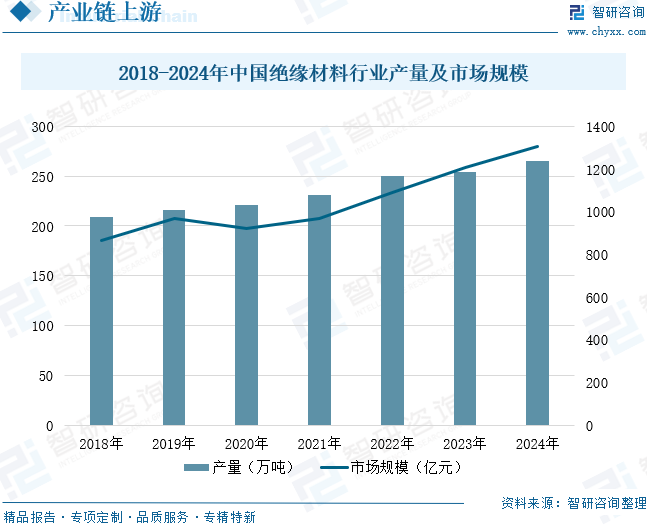 绝缘材料是高频变压器最重要的上游原材料之一,主要用于保障电气安全、提升能效和增强设备可靠性。其核心功能包括实现线圈与铁芯、绕组层间及引出端间的电气隔离,防止击穿短路;通过降低介电损耗提升能量传输效率,减少高频工况下的热积累;同时增强变压器耐高温、防潮及抗化学腐蚀能力,确保其在复杂电磁环境和严苛工况下的长期稳定运行。绝缘材料的性能直接决定了高频变压器的绝缘强度、工作寿命和安全性,对产品小型化、轻量化及高频化发展起着关键支撑作用。绝缘材料是一类具有很高电阻率,能够阻止电流通过的材料,广泛应用于电子、电气设备中,起到绝缘和保护作用。随着国内绝缘材料生产企业技术水平的不断提高,部分产品已经达到较高水平,在国际市场上具有较强的竞争能力。近年来,随着电力、电器、电子、通讯和家电等行业的快速发展,我国绝缘材料产品产量持续增长。数据显示,中国绝缘材料行业产量从2018年的208.45万吨增长至2024年的265.1万吨,年复合增长率为4.09%。市场规模整体也呈现逐年增长的态势,2018-2024年中国绝缘材料行业市场规模从864亿元增长至1305亿元,年复合增长率为7.11%。未来,随着新能源、智能电网、5G通信等新兴领域的快速发展,以及对电气设备能效要求的不断提高,中国绝缘材料行业将在技术创新、产品升级和市场拓展等方面迎来更广阔的发展空间。