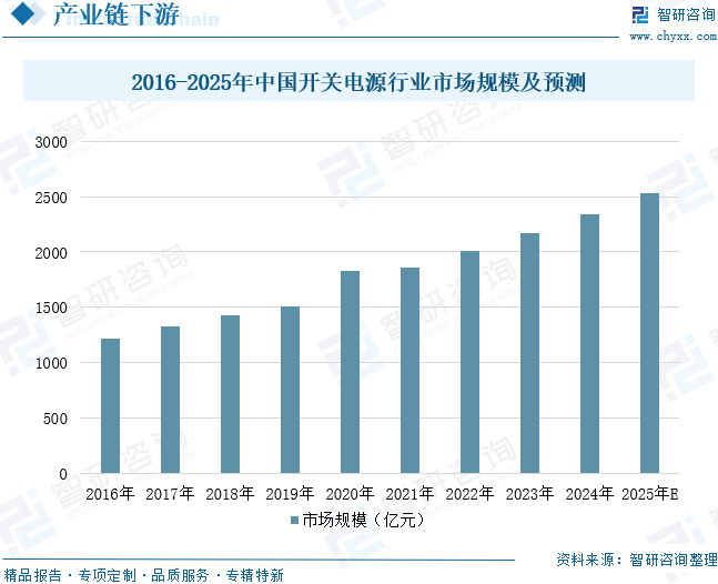 高频变压器在开关电源中扮演着至关重要的角色,它不仅负责能量传输、电压变换,还提供电气隔离功能。其工作频率高达20~100kHz,相较于传统的50/60Hz工频变压器,高频变压器凭借其小巧的体积、轻盈的重量以及卓越的效率,为开关电源的小型化奠定了坚实基础。在开关电源中,高频变压器通过两种方式实现能量传输:一是变压器传输方式,这与普通工频变压器的工作原理相似,通过在初级绕组施加电压产生磁通变化,进而在次级绕组感应出电压,实现能量的传递;二是电感器传输方式,它利用电感储能原理,在初级绕组施加电压产生励磁电流,将电能转化为磁能储存在变压器磁芯中。当励磁电流中断时,次级绕组会产生电流,将磁能转换为电能进行传递。近年来,我国开关电源市场稳定增长,由于其具有小体积、重量轻、高功率密度、高效率、低功耗、高可靠性、稳定输出等众多优势,广泛应用于各大领域。数据显示,2016-2024年中国开关电源行业市场规模从1215亿元增长至2342亿元,年复合增长率为8.55%。预计2025年中国开关电源行业市场规模将增至2532亿元。随着开关电源技术持续创新和应用领域不断拓展,将直接带动高频变压器需求的稳步增长。