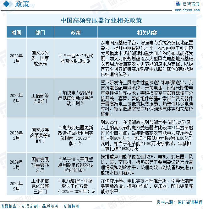 变压器是一种利用电磁感应原理改变交流电压的电气设备,其核心作用是实现电压的转换与传输优化。近年来,中国变压器行业受到各级政府的高度重视和国家产业政策的重点支持。国家陆续出台了多项政策,鼓励变压器行业发展与创新。在此背景下,高频变压器作为细分领域,有望依托行业整体发展态势,在技术突破与市场拓展方面获得新的成长空间。例如,2024年5月,国家发展改革委办公厅印发《关于深入开展重点用能单位能效诊断的通知》,摸排重点用能单位在运锅炉、电机、变压器、风机、泵、空压机、换热器等主要用能设备运行管理情况和能效水平,梳理高效节能装备和先进节能技术应用潜力。2025年9月,工业和信息化部等三部门印发《电力装备行业稳增长工作方案(2025-2026年)》,加快变压器、电机等技术标准升级,引导低端产品更新改造。提高电动机、变压器、配电装备等能效水平。