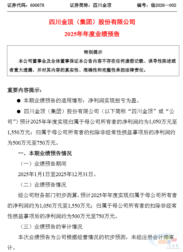 四川金顶(600678.SH)公布,经公司财务部门初步测算,预计2025年年度实现归属于母公司所有者的净利润约为1,050万元至1,550万元;归属于母公司所有者的扣除非经常性损益事项后的净利润约为500万元至750万元。