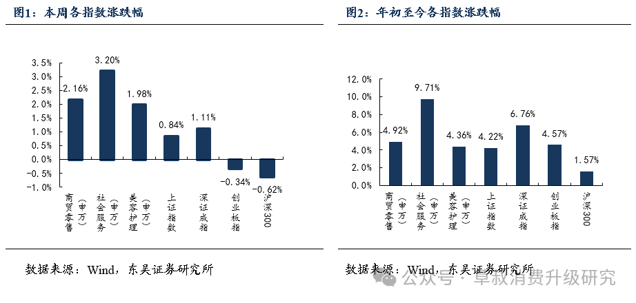 本周(1月26日至2月1日),申万商贸零售指数涨跌幅+2.16%,申万社会服务+3.20%,申万美容护理+1.98%,上证综指+0.84%,深证成指+1.11%,创业板指-0.34%,沪深300指数-0.62%。