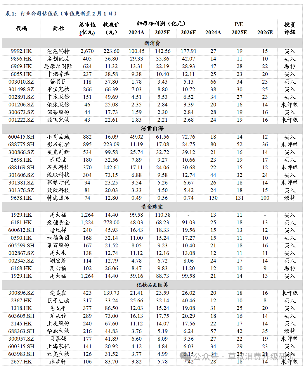 细分行业公司估值表