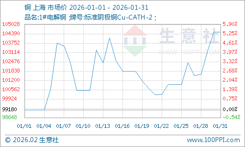 生意社监测数据显示,1月铜价宽幅震荡为主。月初铜价为99180元/吨,月末铜价涨至104496.67元/吨,整体涨幅为5.36%,同比上涨34.05%。