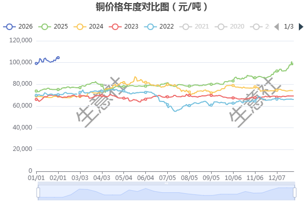 据生意社年度价格对比图显示,近五年,2月份铜涨多跌少。