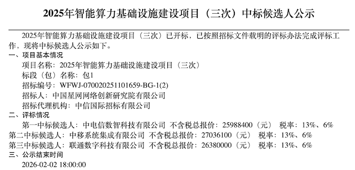 日前,中国星网公示2025年智能算力基础设施建设项目的中标候选人。中电信数智科技有限公司力压两家竞争对手,排名第一。
