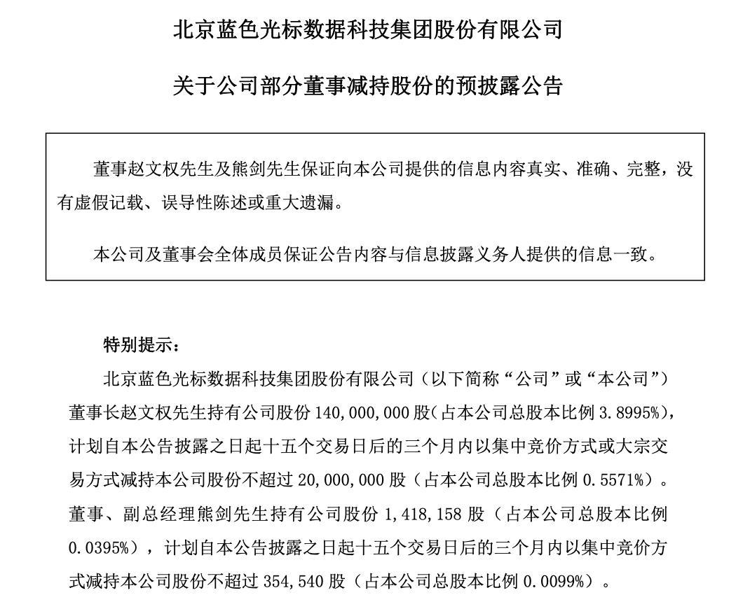 根据公告,赵文权计划减持不超过2000万股,占蓝色光标总股本的0.5571%;熊剑则计划顶格减持不超过35.45万股,占其总持股比例的25%,减持原因均为“股东自身资金需求”。