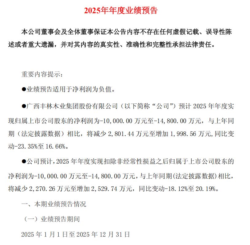 丰林集团:2025年净利润预亏1亿元至1.48亿元