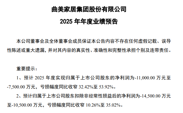 曲美家居预计2025年亏损1.10亿元至7500万元