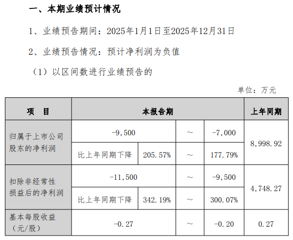 根据公司1月30日晚间发布的业绩预告,预计2025年度归属于上市公司股东的净利润将出现大幅亏损8.5亿元至11.5亿元,与上年同期盈利约7.69亿元相比,业绩亏损扩大。值得注意的是,尽管整体净利润陷入巨额亏损,但公司扣除非经常性损益后的净利润仍保持盈利,预计为1.05亿元至1.55亿元,不过较上年同期下降82.59%-88.21%。