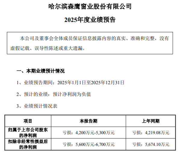 1月26日,森鹰窗业(301227.SZ)公布,预计2025年亏损4,200万元-5,300万元,上年同期亏损4,219.08万元;扣非亏损5,600万元-6,700万元。