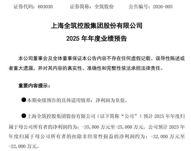 1月30日,上海全筑控股集团股份有限公司(以下简称“全筑股份”)披露了2025年年度业绩预告,数据显示公司预计将延续亏损状态,且亏损幅度较上年同期显著扩大。