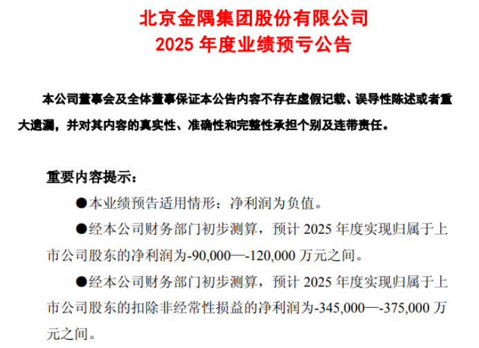 1月15日,金隅集团发布2025年度业绩预亏公告。公司预计2025年度归属于上市公司股东的净利润为亏损90,000万元至120,000万元,较上年同期的亏损55,516万元有所扩大。值得注意的是,扣除非经常性损益后的净利润预计亏损更为显著,区间为345,000万元至375,000万元,与上年同期的亏损285,939万元相比,亏损额亦进一步增加。