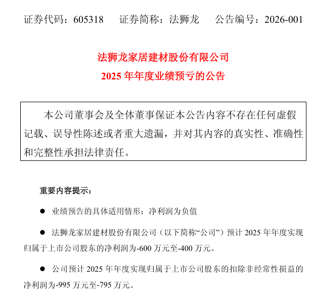 1月22日,法狮龙家居建材股份有限公司(简称“法狮龙”)发布2025年年度业绩预亏公告。公告显示,经公司财务部门初步测算,预计2025年度归属于上市公司股东的净利润将出现亏损,区间为-600万元至-400万元;扣除非经常性损益后的净利润亏损幅度更大,预计在-995万元至-795万元之间。