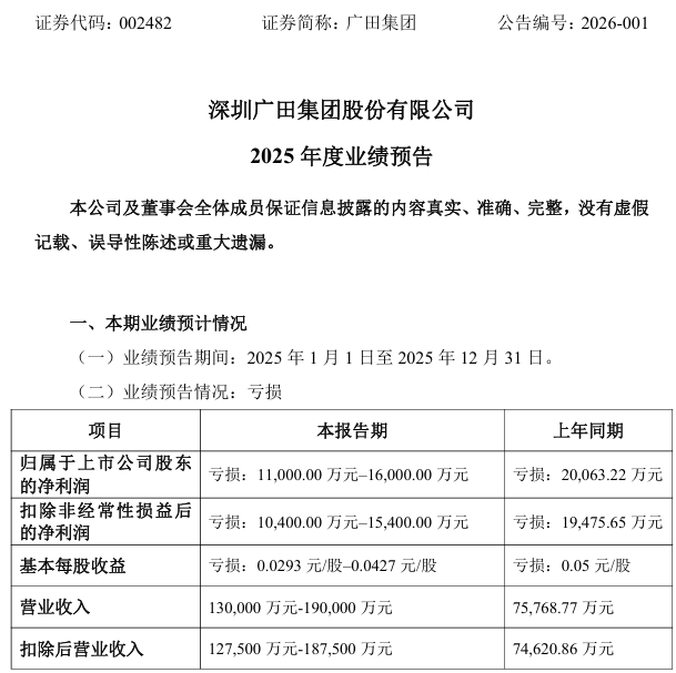 1月30日,深圳广田集团股份有限公司(以下简称“广田集团”)发布了2025年度业绩预告。公告显示,公司预计在2025年报告期内仍将处于亏损状态,但较上年同期亏损幅度有明显收窄。