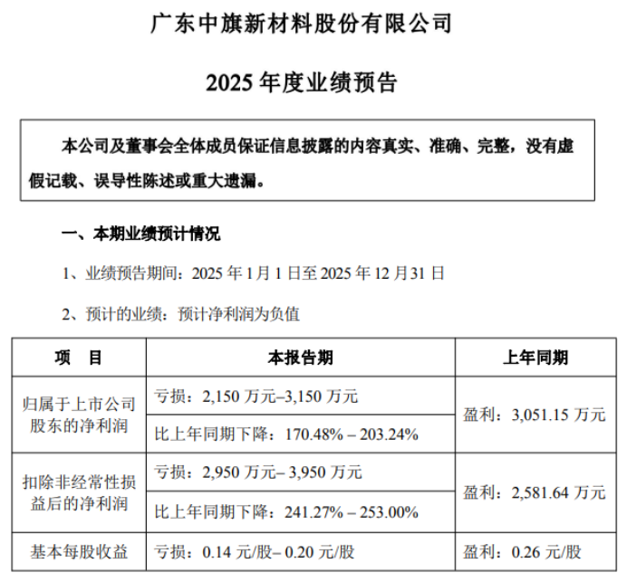 1月15日,中旗新材2025年度业绩预亏公告。公司预计2025年1-12月业绩预亏,归属于上市公司股东的净利润为-3150.00万至-2150.00万,净利润同比下降203.24%至170.48%,预计基本每股收益为-0.2至-0.14元。