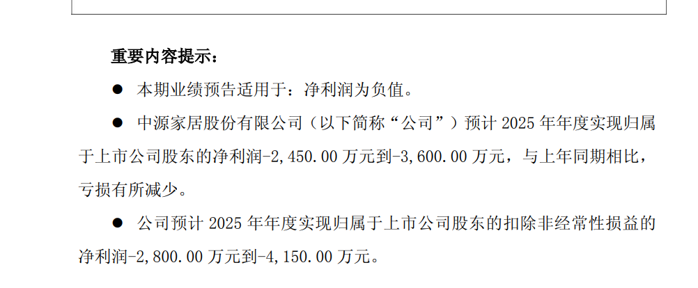 近日,中源家居(603709.SH)发布2025年年度业绩预告。中源家居预计2025年年度实现归属于上市公司股东的净利润-2450万元到-3600万元,与上年同期相比,亏损有所减少。中源家居预计2025年年度实现归属于上市公司股东的扣除非经常性损益的净利润-2800万元到-4150万元。