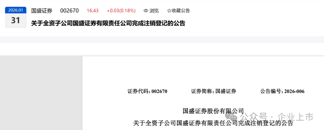 2026年1月30日,国盛证券股份有限公司发布公告称,其全资子公司“国盛证券有限责任公司”已完成工商注销登记。此次注销是依据中国证监会2025年的批复,由母公司国盛金融控股集团吸收合并子公司,并更名为“国盛证券股份有限公司”的整体方案的最后一步。
