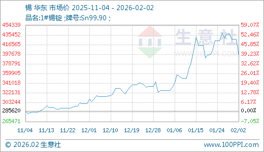 据生意社监测,锡02月02日最新价格393410.00元/吨,最近30天上涨20.55%,60天上涨24.05%。