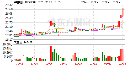 名雕股份盘中涨停,已连收3个涨停板,截至9:49,该股报28.14元,换手率20.36%,成交量1361.05万股,成交金额3.69亿元,连续涨停期间,该股累计上涨33.11%,累计换手率为51.85%。最新A股总市值达37.52亿元,A股流通市值18.81亿元。