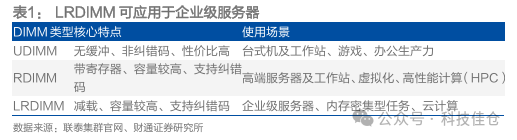 服务器中存在三种主流的内存模组技术。服务器中三种主流内存条技术为UDIMM、RDIMM和LRDIMM,其中UDIMM为无缓冲双列直插内存模块,不使用寄存器,无需缓冲,同等频率下延迟较小,为日常计算提供高性价比方案;RDIMM为带寄存器的双列直插内存模块,相较于UDIMM,具备更高的稳定性和性能。它集成了一个寄存器或缓冲器,可提升信号完整性,并降低内存控制器的电气负载,为服务器与工作站提供更高稳定性和内存容量;LRDIMM为低负载双列直插内存模块,通过进一步降低电气负载、提升信号完整性,将内存性能提升到新高度。这类模块拥有所有DIMM类型中最高的内存容量,专为极高要求的计算环境设计,是企业环境中高性能计算与内存密集型任务的首选。