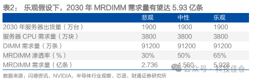 乐观假设下,2030年MRDIMM需求量有望达5.93亿条。据闪德资讯,2030年全球服务器出货量有望到1900万台,并假设服务器为双路服务器,同时,据半导体行业观察,以英特尔至强6900P系列为例,每个CPU配备12个内存通道,共24个DIMM插槽。假设插槽利用率为100%,假设MRDIMM在悲观、中性、乐观情况下的渗透率分别为30%、50%和65%,2030年MRDIMM数量有望分别为2.74/4.56/5.93亿条。