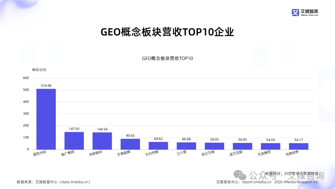 监测数据显示,GEO板块营收前三名企业依次为:蓝色光标(510.98亿元)、省广集团(147.93亿元)、利欧股份(144.54亿元)。艾媒咨询分析师认为,头部企业营收分布显示蓝色光标占据绝对优势,营收集中度较高,前三名占比达到64.70%,市场地位稳固。主营业务涵盖广告、数字营销、内容制作等,反映了行业营收结构的多元化和健康度。营收规模与企业发展阶段关联性强,头部企业多为成熟期,市场竞争力显著。