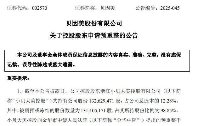 近日,贝因美(维权)(002570.SZ)发布公告,其控股股东浙江小贝大美控股有限公司向法院提出的预重整申请迎来进展,浙江省金华市中级人民法院已裁定受理小贝大美控股前期提出的预重整申请,其第一次债权人会议尚在表决过程中。