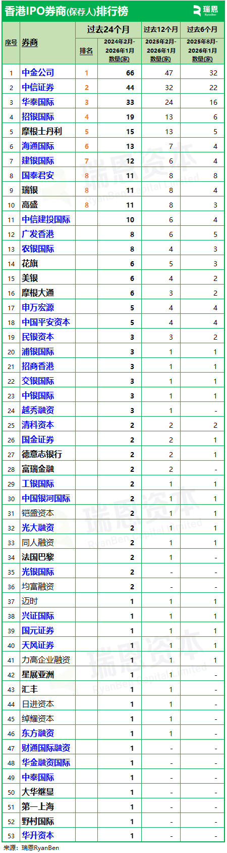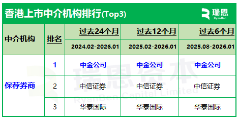 建银国际、中信建投国际、广发香港,各以6家并列排在第十位,保荐参与率 4.9%。
