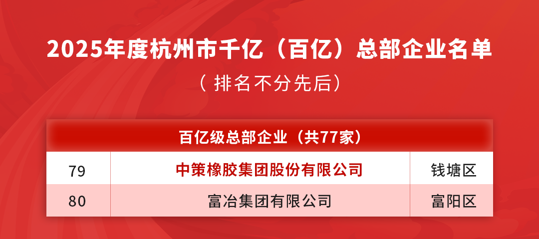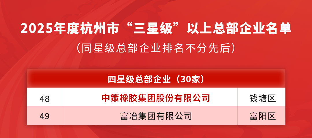 据悉,杭州市2025年度星级总部企业评定依据《杭州市人民政府办公厅关于进一步推动杭州总部经济高质量发展的实施意见》精神开展,通过营收规模、地方财政贡献、研发投入、就业带动及成长性等多维度硬指标进行综合加权赋分。在激烈竞争中,中策橡胶从众多参评企业中脱颖而出,成为仅有的30家“四星级总部企业”和77家“百亿级总部企业”之一。