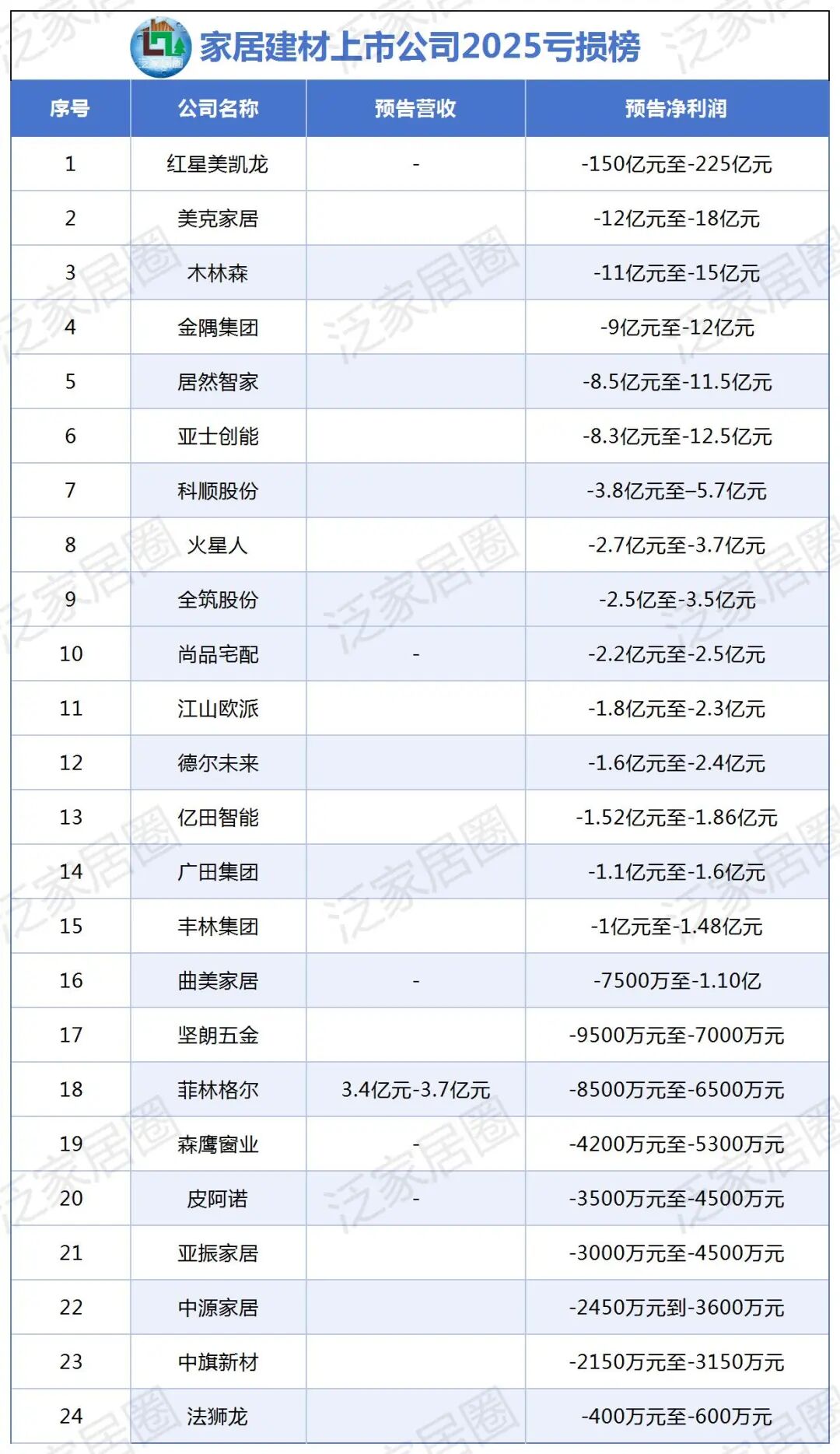 作为房地产下游的重要环节,家居建材行业在2025年同样面临严峻挑战。以下为部分家居建材上市公司发布的业绩预告亏损情况: